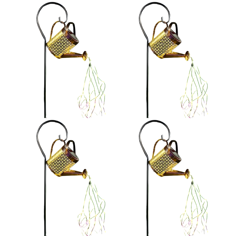 The metal construction ensures durability, while the integrated solar panel provides a sustainable lighting solution. The pre-installed LED string lights cascade from the spout, creating a mesmerizing "pouring water" effect that enhances any garden, patio, or pathway.