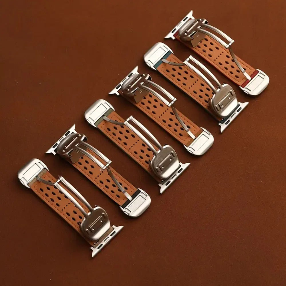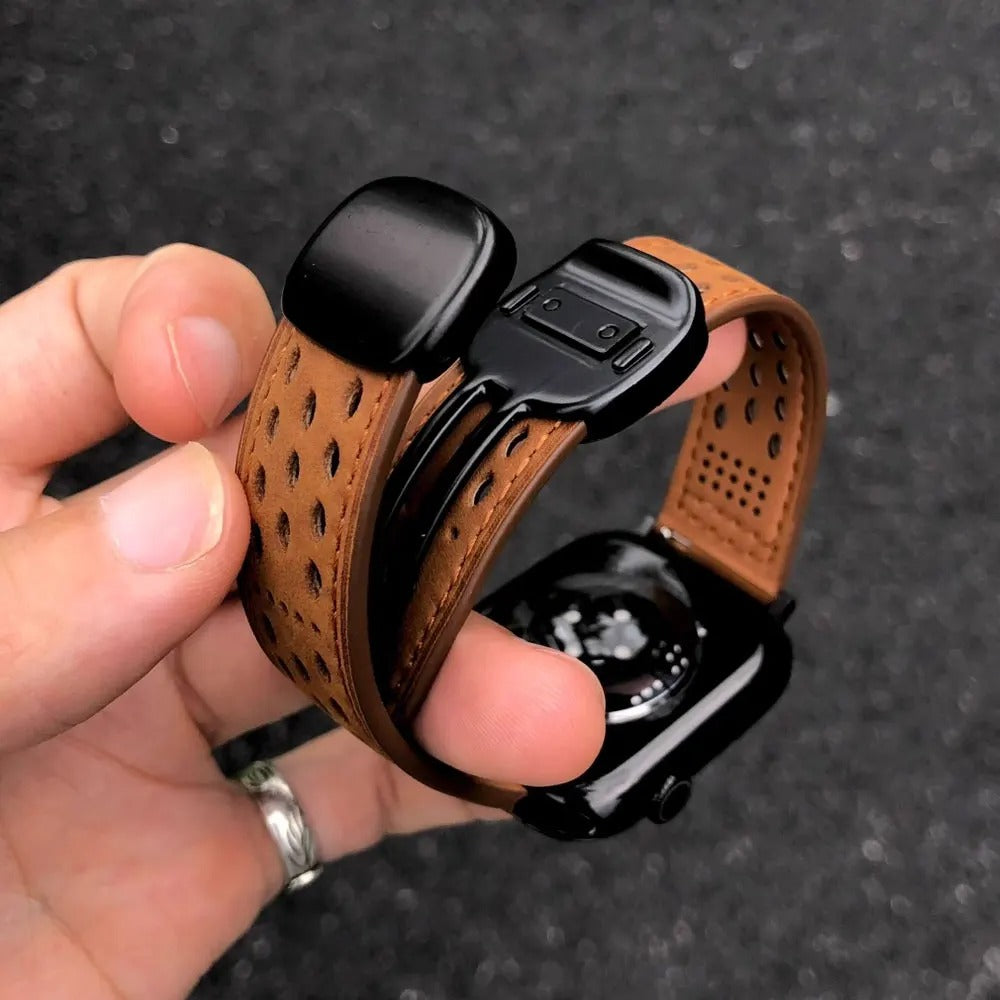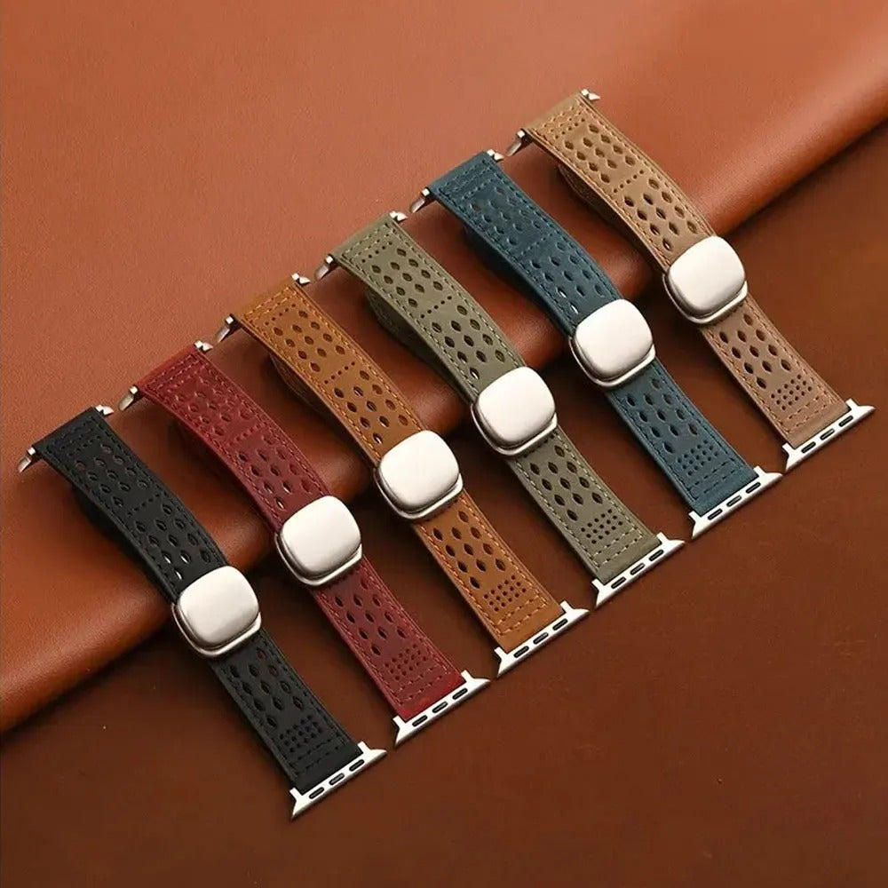 This product is a leather watch strap designed to be compatible with various Apple Watch models and sizes. It features a magnetic closure mechanism for easy attachment and detachment from the wrist. The strap includes a unique pattern of perforations and is available in multiple colors.