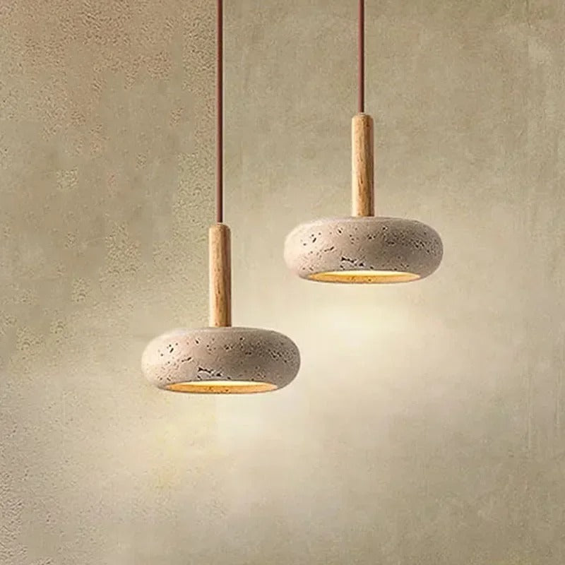 Transform your living space with the warm, inviting glow of this Wabi-Sabi inspired pendant light. Its unique design, featuring natural travertine stone and wood, brings a touch of organic elegance to any room. This fixture is perfect for creating a cozy and stylish atmosphere over a dining table, kitchen island, or in a living room.