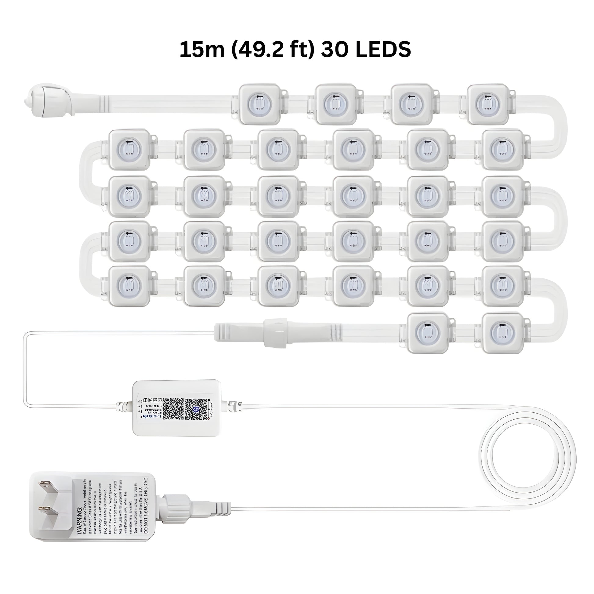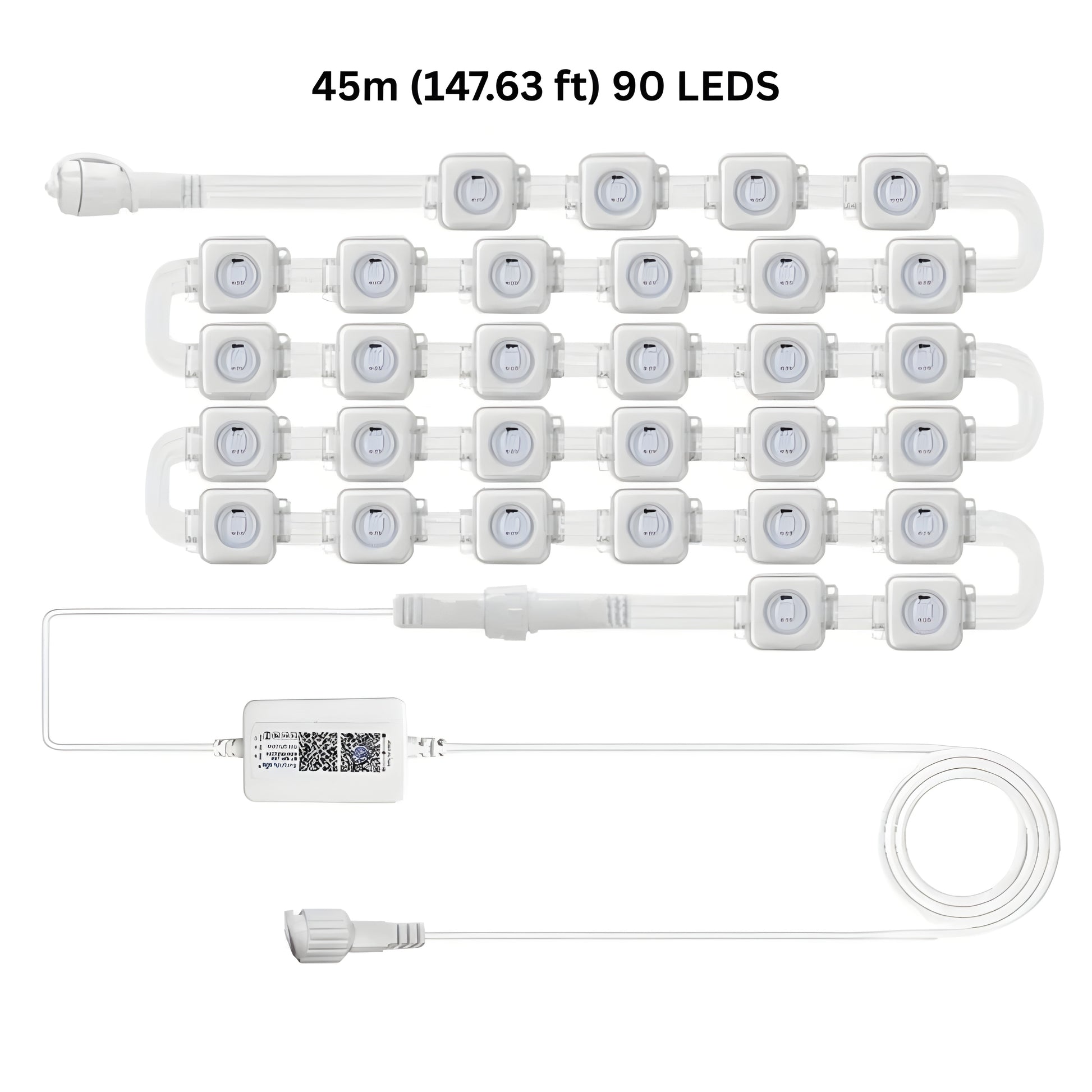 - LED Number Options: 5m/10 LEDs, 10m/20 LEDs, 15m/30 LEDs, 20m/40 LEDs, 30m/60 LEDs, 45m/90 LEDs (Note: 45m/90 LEDs not explicitly listed in text but shown in image.)